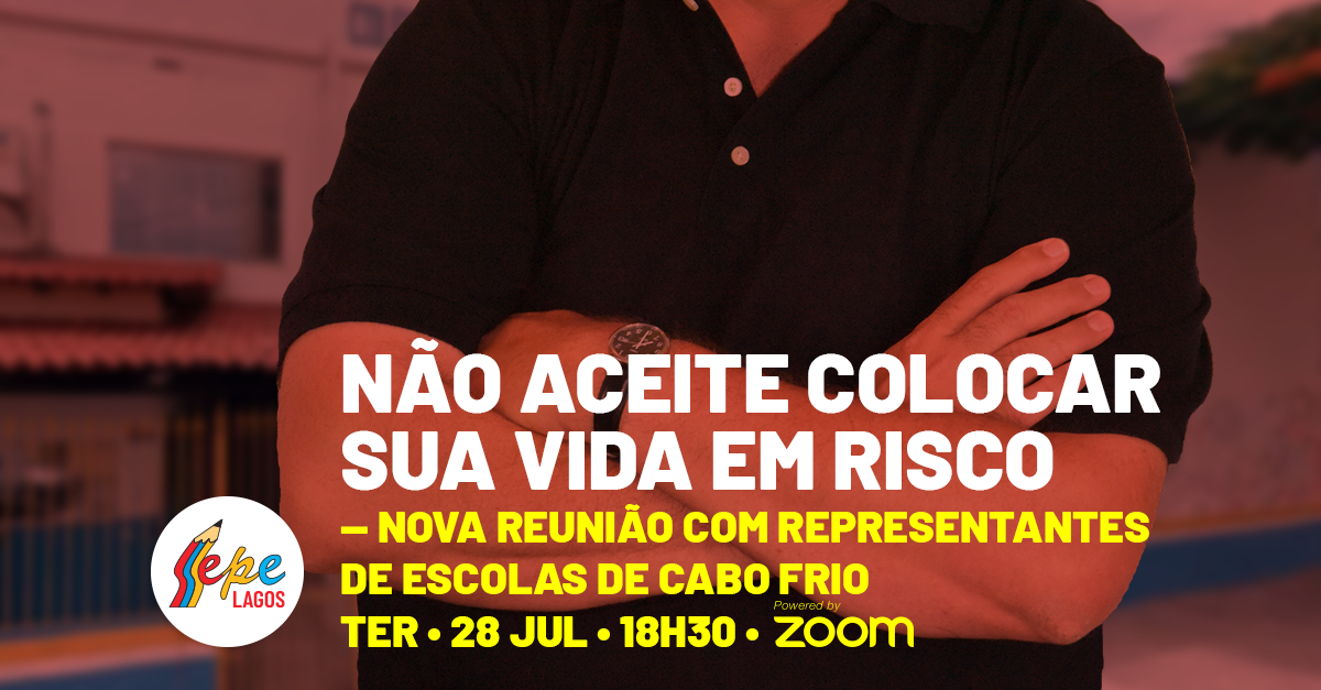 Nesta terça, 28/07, haverá outra reunião para dar prosseguimento às discussões sobre as condições necessárias para o retorno do trabalho presencial nas escolas municipais de Cabo Frio com garantia de segurança sanitária. Os representantes escolhidos por cada unidade de ensino da cidade continuarão o debate com a direção do Sepe Lagos às 18h30, por meio do aplicativo Zoom.