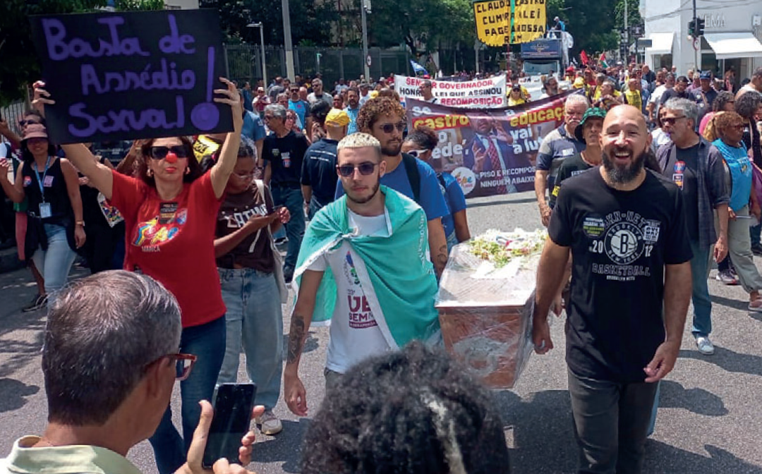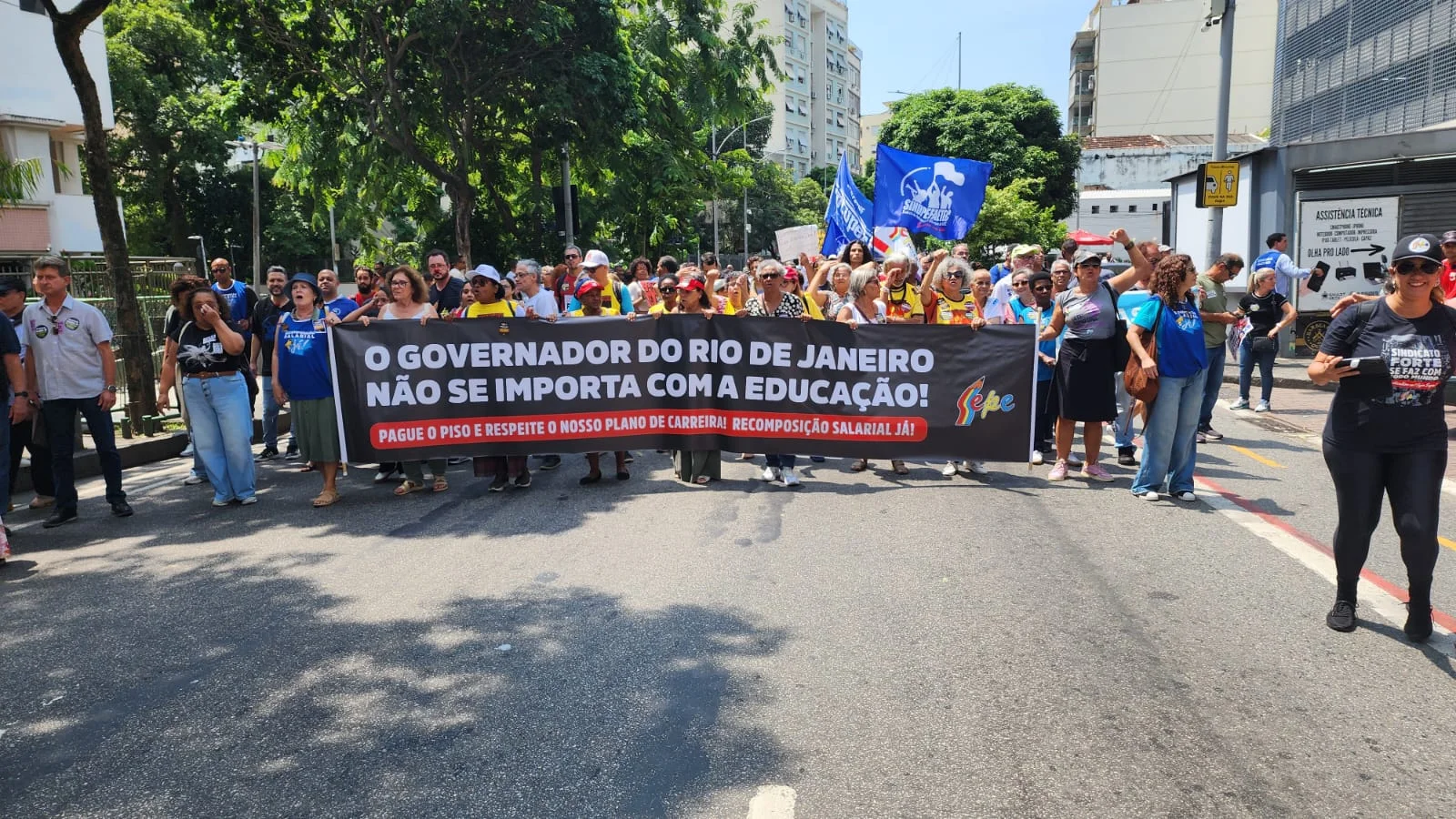 Os profissionais da rede estadual participaram da passeata e do ato de protesto conjunto do funcionalismo estadual hoje (18), no Palácio Guanabara, para cobrar do governador Cláudio Castro o pagamento do restante da recomposição salarial, referente aos anos de 2023 e 2024. Hoje a rede estadual e outras as categorias do serviço público estadual fizeram uma paralisação de 24 horas para participar da passeata até o Palácio Guanabara. Desde o início da manhã, os servidores iniciaram a concentração, no Largo do Machado, onde os representantes das entidades representativas do funcionalismo denunciaram para a população as mazelas do governo Cláudio Castro para com o serviço público do estado, há três anos sem reajuste e com perdas salariais que ultrapassam os 50%.